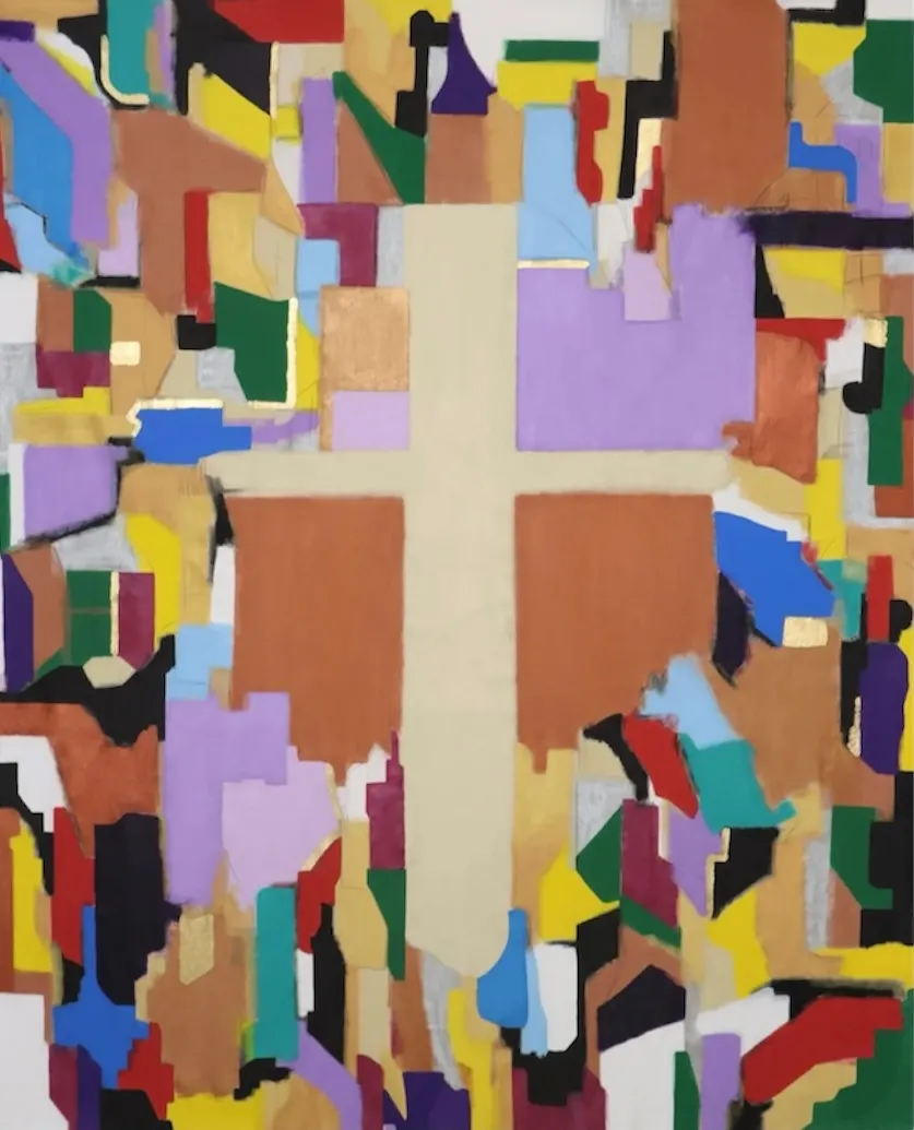 The show speaks as a retrospective of Parker’s early years as he followed his grandfather closely, studying his leadership and charisma. While the series’ consistent backdrop is remnant of traditional baptist churches’ stained glass windows, the foregrounds all tell a story of how the Black American Church serves an invaluable asset to its members and community. “A Covenant With You”, the highest standing canvas bears a glowing blue cross seeming to rise out of the assembled formation of patterns, textures and colors found throughout the body of work. While show “Court of Two Sisters” gives a peak st southern fashion in the church as two young girls are shown in Sunday dresses bow-tied at the rear while “Highly Favored”, another towering piece that signals youth curiosity and discipline centering another young girl with a more solid but layered golden canvas, almost resembling an aged plaque, as she reads what I’d take as a Bible or Sunday School workbook. LAW paints dynamic scenes of the many ways the community interacts with the Black Church including a pastor delivering a sermon in “Up a Little Higher” to newlyweds posing with a bouquet positioning the church as sacred place for unity and matrimonial practices. AME's elaborate design assists in shaping LAW’s conceptual perspective of “church” as you make your way around the raised pulpit area, stretching around the altar just before the front rows of church pews, down the aisles, and out of the sanctuary into the narthex.