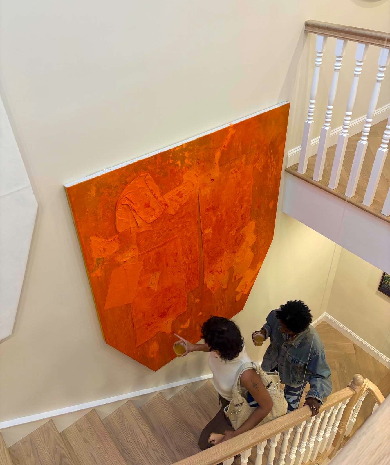 In the three-flight exhibition, the staircase itself became a site of encounter where viewers moved not only between levels but between the show’s thematic sensibilities. Several works engaged this passageway. Reginald Sylvester II’s "No Man Knows The Day or the Hour" (2025), an orange work that oscillates between painting and sculpture, had a powerful presence. For me, Sylvester’s piece mirrored a sanctuary-like experience that the exhibition as a whole invoked. It felt like a work made to dwell within spiritual architecture, as it is itself. Days later, in a conversation with my professor about Mark Rothko’s chapel paintings, Sylvester’s work came back to me, re-emphasizing that encounter as a kind of contemporary counterpart to the chapel experience. Sylvester, whose practice negotiates the terrain between spiritual inquiry, corporeal labor, and formalist experimentation, situates abstraction as a site of devotion. Positioned within the sub-theme of Root Matter, where color and material are treated as embodied frequencies tied to ancestral memory, intuitive assertion, and embedded knowledge, the work resonated as both threshold and prayer.