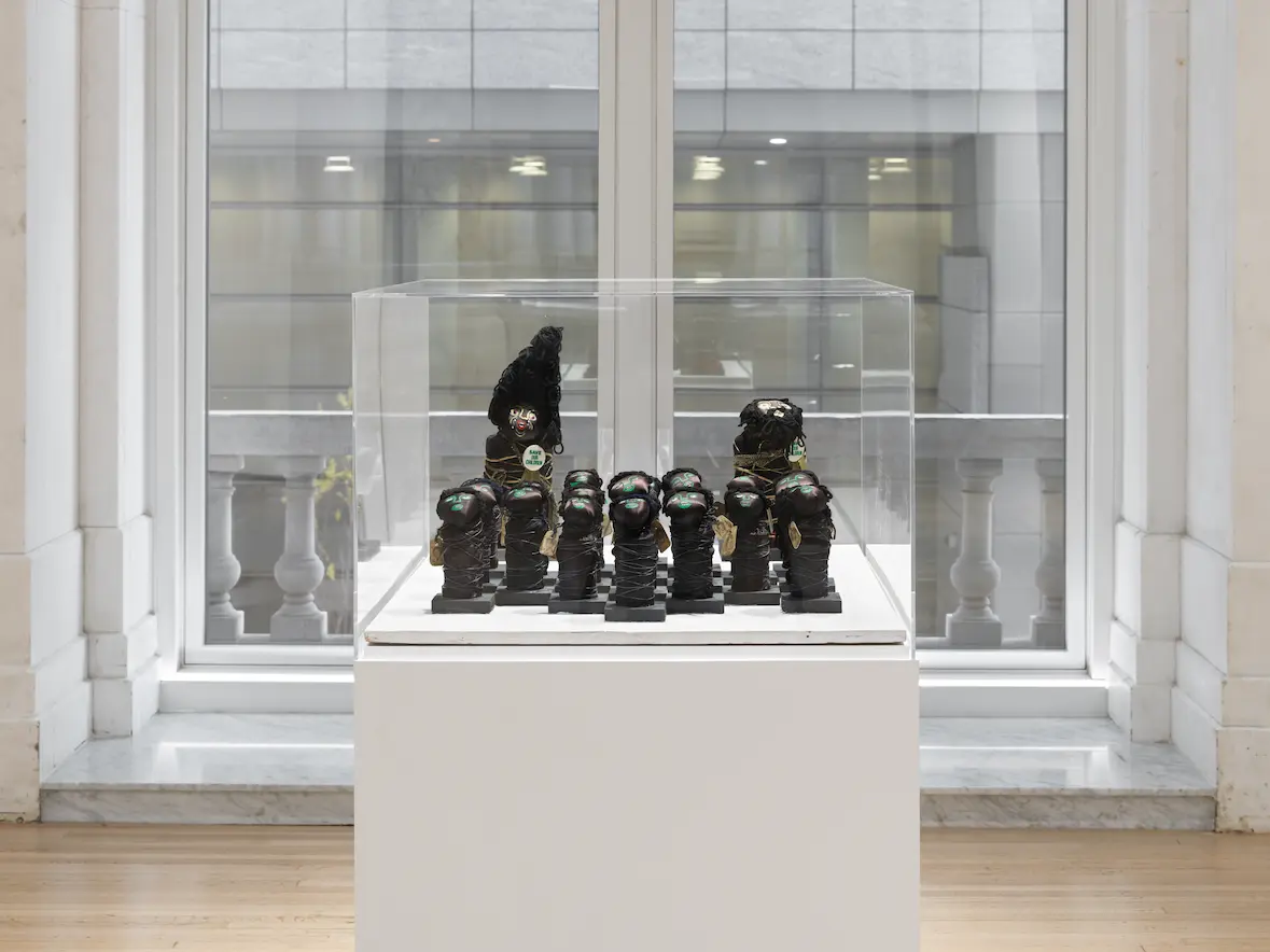 While Ringgold’s kaleidoscope of colors often feels dreamlike to me, as if I am Cassie from Tar Beach, soaring above the city, I am reminded that each work is built from layers of storytelling and history. This becomes especially clear when confronted with Atlanta Children, whose message remains devastatingly relevant. Representing Ringgold’s sculptural practice, the work features small mummified children, each adorned with name tags and photographs of the children murdered in Atlanta during the 1970s and 1980s. Pins bearing words allude to lives lost too soon, urging us to save our children.